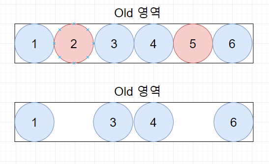 - Old 영역에서 쓰지 않는 객체를 표시해서 한곳으로 모으고 삭제하는 Mark & Sweep Compact알고리즘 사용